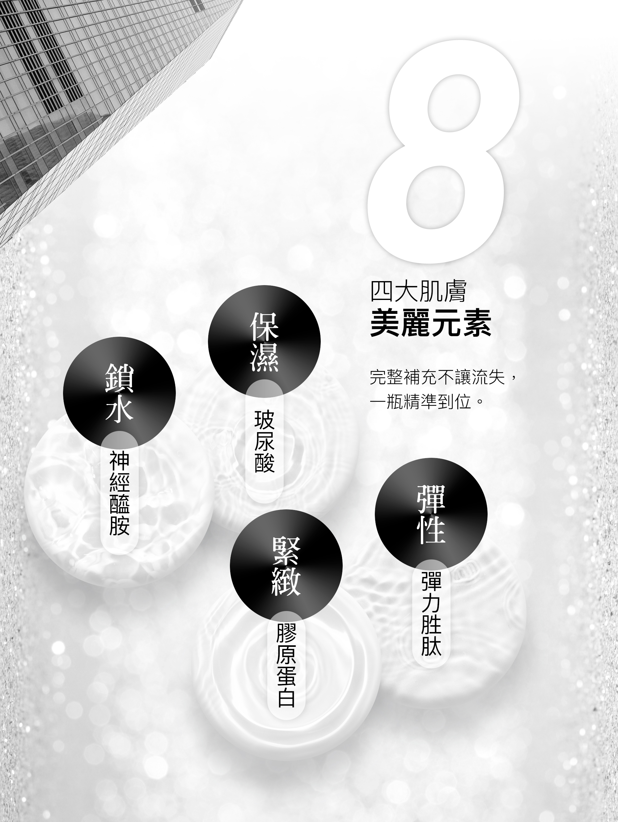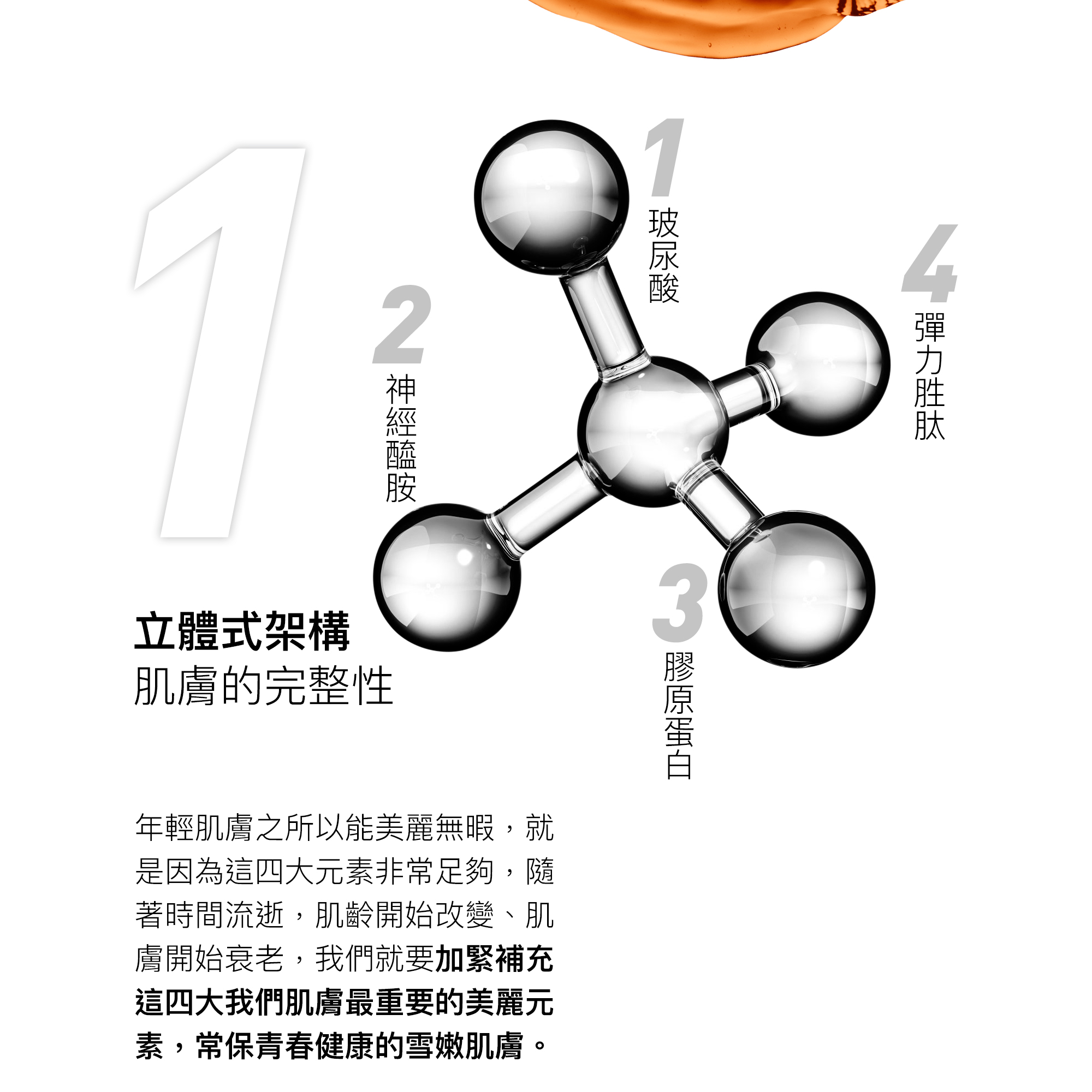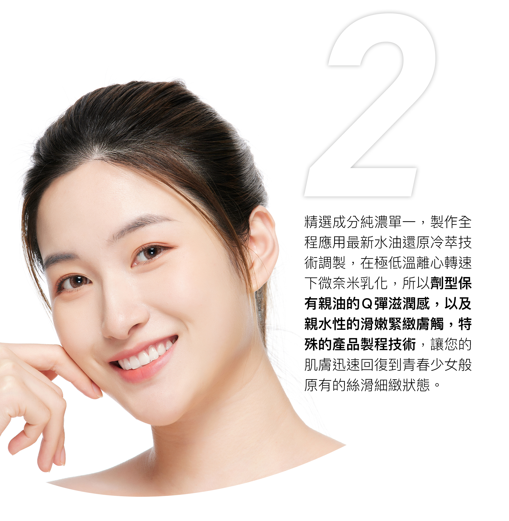 用途: 內含肌膚原有且最容易流失的四大美麗元素(神經醯胺、玻尿酸、膠原蛋白、彈力胜肽),結合本品特殊絲絨彈潤原乳般的親膚劑型,鎖水、保濕、緊緻、彈性,完整補充、滴滴精純吸收到位。